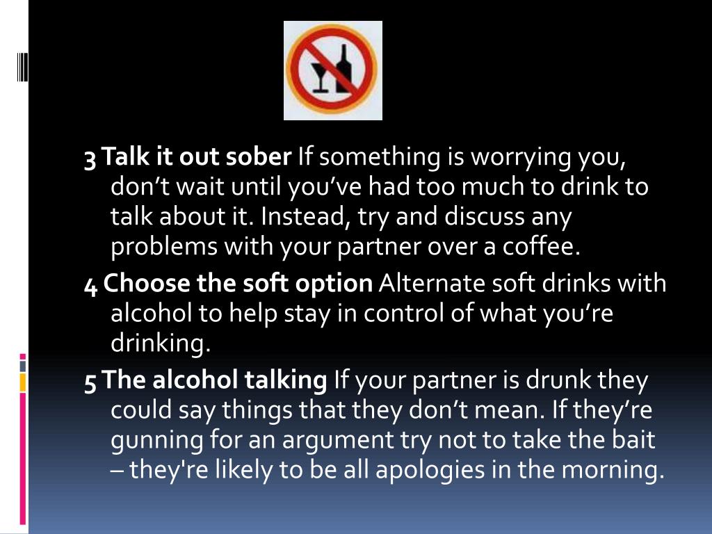 3 Talk it out sober If something is worrying you, don’t wait until you’ve had too much to drink to talk about it. Instead, try and discuss any problems with your partner over a coffee. 4 Choose the soft option Alternate soft drinks with alcohol to help stay in control of what you’re drinking. 5 The alcohol talking If your partner is drunk they could say things that they don’t mean. If they’re gunning for an argument try not to take the bait – they're likely to be all apologies in the morning.