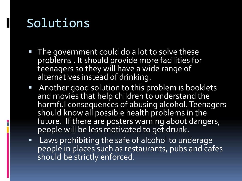 Solutions • The government could do a lot to solve these problems . It should provide more facilities for teenagers so they will have a wide range of alternatives instead of drinking. • Another good solution to this problem is booklets and movies that help children to understand the harmful consequences of abusing alcohol. Teenagers should know all possible health problems in the future. If there are posters warning about dangers, people will be less motivated to get drunk. • Laws prohibiting the safe of alcohol to underage people in places such as restaurants, pubs and cafes should be strictly enforced.