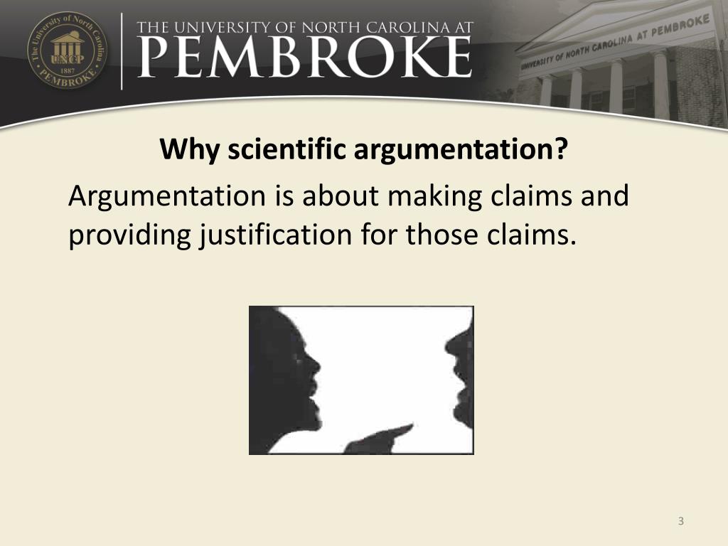 Why scientific argumentation? Argumentation is about making claims and providing justification for those claims.