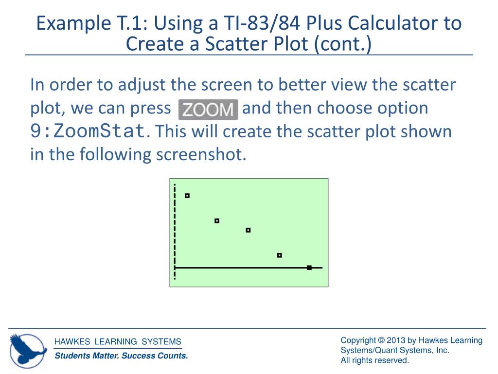Example T.1: Using a TI-83/84 Plus Calculator to Create a Scatter Plot (cont.) In order to adjust the screen to better view the scatter plot, we can press and then choose option 9:ZoomStat. This will create the scatter plot shown in the following screenshot.
