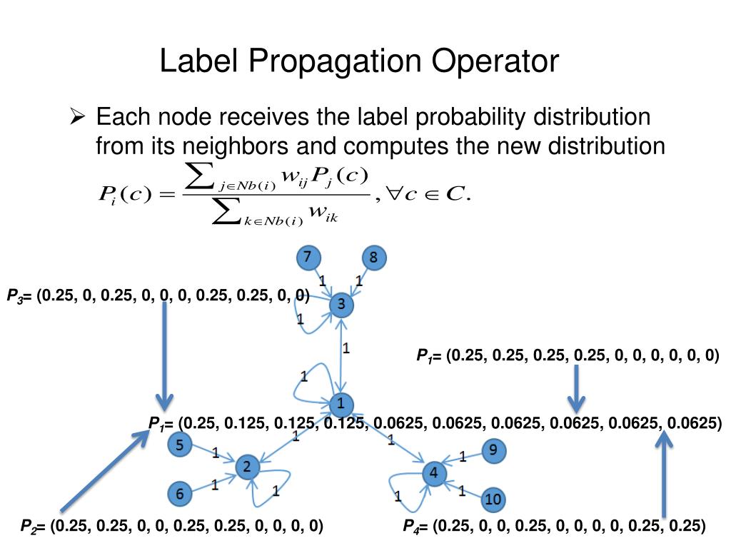 Label Propagation Operator • Each node receives the label probability distribution from its neighbors and computes the new distribution P3= (0.25, 0, 0.25, 0, 0, 0, 0.25, 0.25, 0, 0) P1= (0.25, 0.25, 0.25, 0.25, 0, 0, 0, 0, 0, 0) P1= (0.25, 0.125, 0.125, 0.125, 0.0625, 0.0625, 0.0625, 0.0625, 0.0625, 0.0625) P2= (0.25, 0.25, 0, 0, 0.25, 0.25, 0, 0, 0, 0) P4= (0.25, 0, 0, 0.25, 0, 0, 0, 0, 0.25, 0.25)