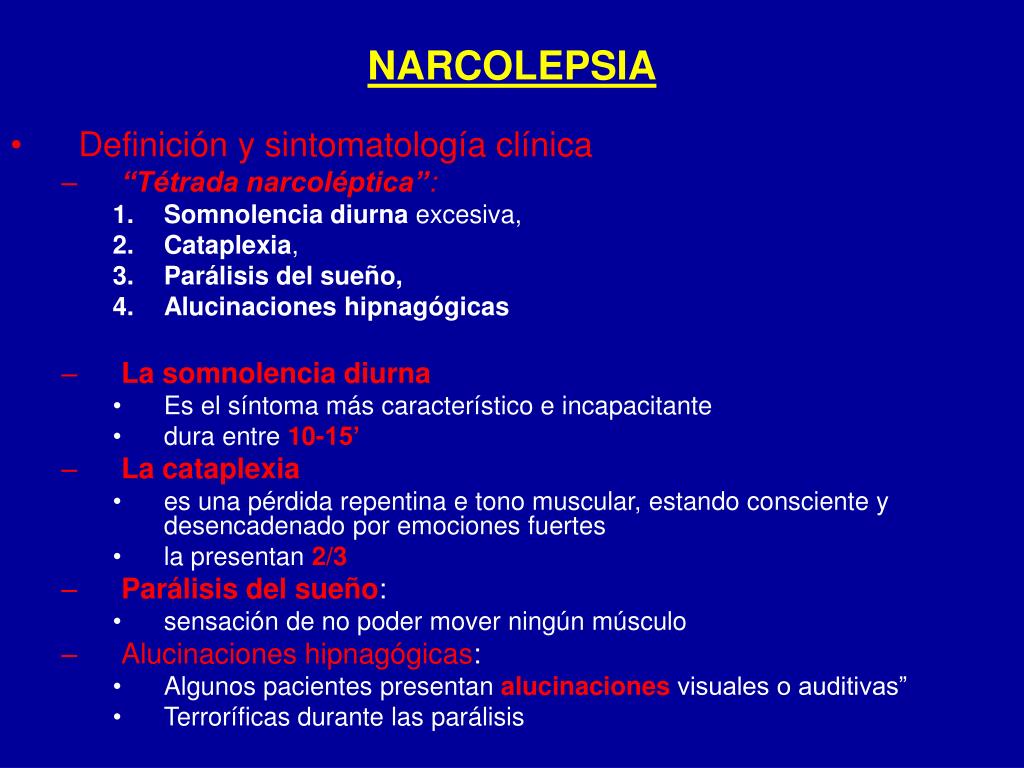 NARCOLEPSIA • Definición y sintomatología clínica • “Tétrada narcoléptica”: • Somnolencia diurna excesiva, • Cataplexia, • Parálisis del sueño, • Alucinaciones hipnagógicas • La somnolencia diurna • Es el síntoma más característico e incapacitante • dura entre 10-15’ • La cataplexia • es una pérdida repentina e tono muscular, estando consciente y desencadenado por emociones fuertes • la presentan 2/3 • Parálisis del sueño: • sensación de no poder mover ningún músculo • Alucinaciones hipnagógicas: • Algunos pacientes presentan alucinaciones visuales o auditivas” • Terroríficas durante las parálisis