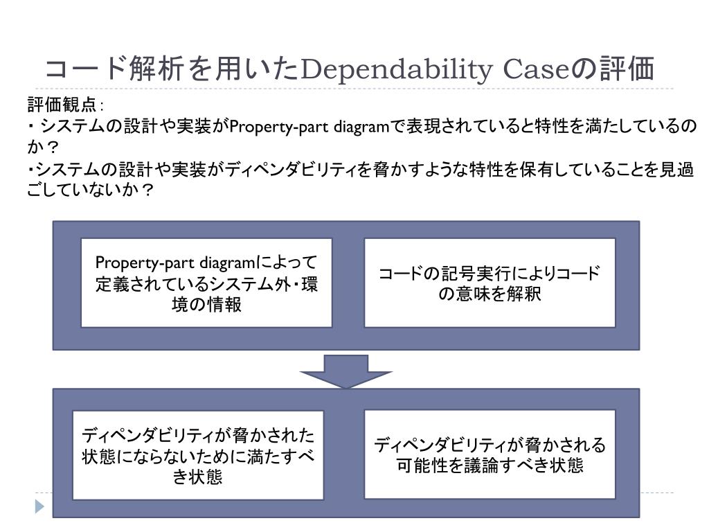 コード解析を用いたDependabilityCaseの評価 評価観点: ・ システムの設計や実装がProperty-partdiagramで表現されていると特性を満たしているのか? ・システムの設計や実装がディペンダビリティを脅かすような特性を保有していることを見過ごしていないか? Property-partdiagramによって定義されているシステム外・環境の情報 コードの記号実行によりコードの意味を解釈 ディペンダビリティが脅かされる可能性を議論すべき状態 ディペンダビリティが脅かされた状態にならないために満たすべき状態