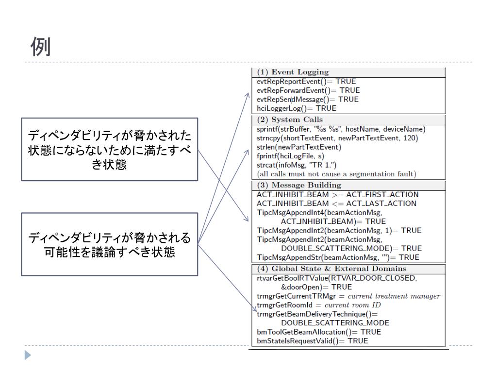 例 ディペンダビリティが脅かされた状態にならないために満たすべき状態 ディペンダビリティが脅かされる可能性を議論すべき状態