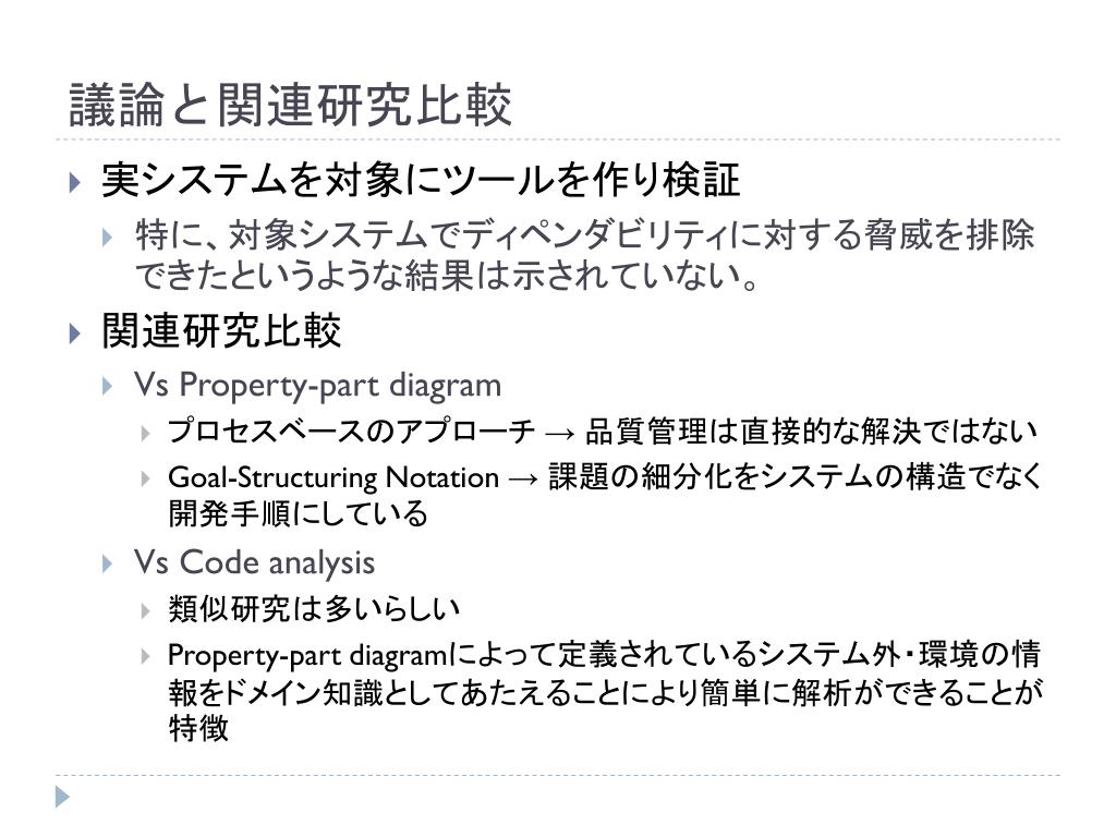 議論と関連研究比較 • 実システムを対象にツールを作り検証 • 特に、対象システムでディペンダビリティに対する脅威を排除できたというような結果は示されていない。 • 関連研究比較 • VsProperty-partdiagram • プロセスベースのアプローチ → 品質管理は直接的な解決ではない • Goal-StructuringNotation→ 課題の細分化をシステムの構造でなく開発手順にしている • VsCodeanalysis • 類似研究は多いらしい • Property-partdiagramによって定義されているシステム外・環境の情報をドメイン知識としてあたえることにより簡単に解析ができることが特徴
