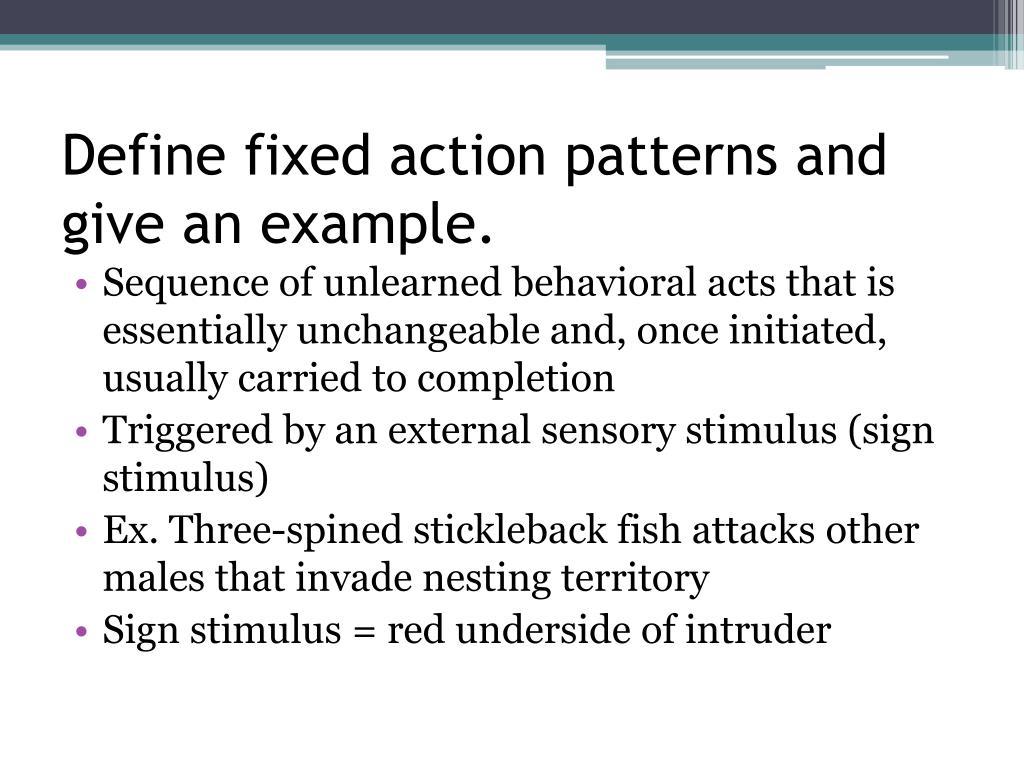 Define fixed action patterns and give an example. • Sequence of unlearned behavioral acts that is essentially unchangeable and, once initiated, usually carried to completion • Triggered by an external sensory stimulus (sign stimulus) • Ex. Three-spined stickleback fish attacks other males that invade nesting territory • Sign stimulus = red underside of intruder