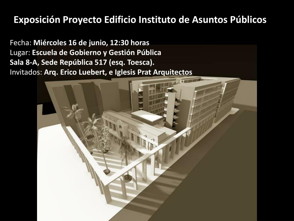 Exposición Proyecto Edificio Instituto de Asuntos Públicos Fecha:Miércoles 16 de junio, 12:30 horas Lugar: Escuela de Gobierno y Gestión Pública Sala 8-A, Sede República 517 (esq. Toesca). Invitados: Arq. EricoLuebert, e Iglesis Prat Arquitectos