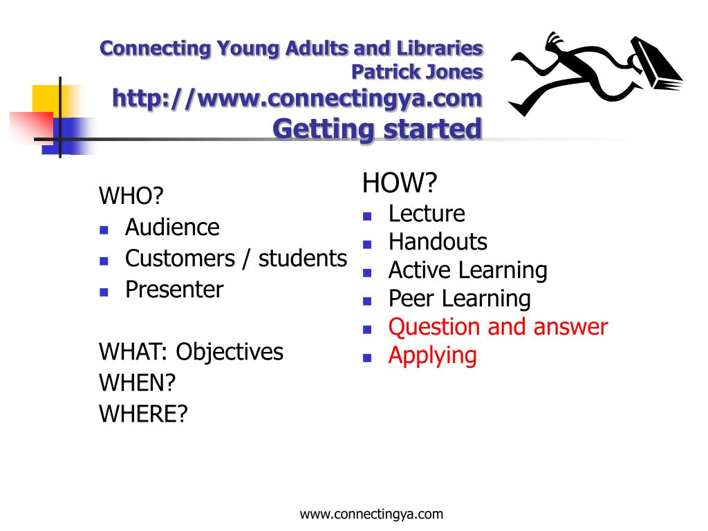WHO? Audience Customers / students Presenter WHAT: Objectives WHEN? WHERE? HOW? Lecture Handouts Active Learning Peer Learning Question and answer Applying Connecting Young Adults and LibrariesPatrick Joneshttp://www.connectingya.comGetting started www.connectingya.com