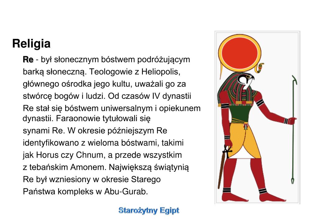 Religia • Re - był słonecznym bóstwem podróżującym • barką słoneczną. Teologowie z Heliopolis, • głównego ośrodka jego kultu, uważali go za • stwórcę bogów i ludzi. Od czasów IV dynastii • Re stał się bóstwem uniwersalnym i opiekunem dynastii. Faraonowie tytułowali się • synami Re. W okresie późniejszym Re • identyfikowano z wieloma bóstwami, takimi • jak Horus czy Chnum, a przede wszystkim • z tebańskim Amonem. Największą świątynią • Re był wzniesiony w okresie Starego • Państwa kompleks w Abu-Gurab. Starożytny Egipt