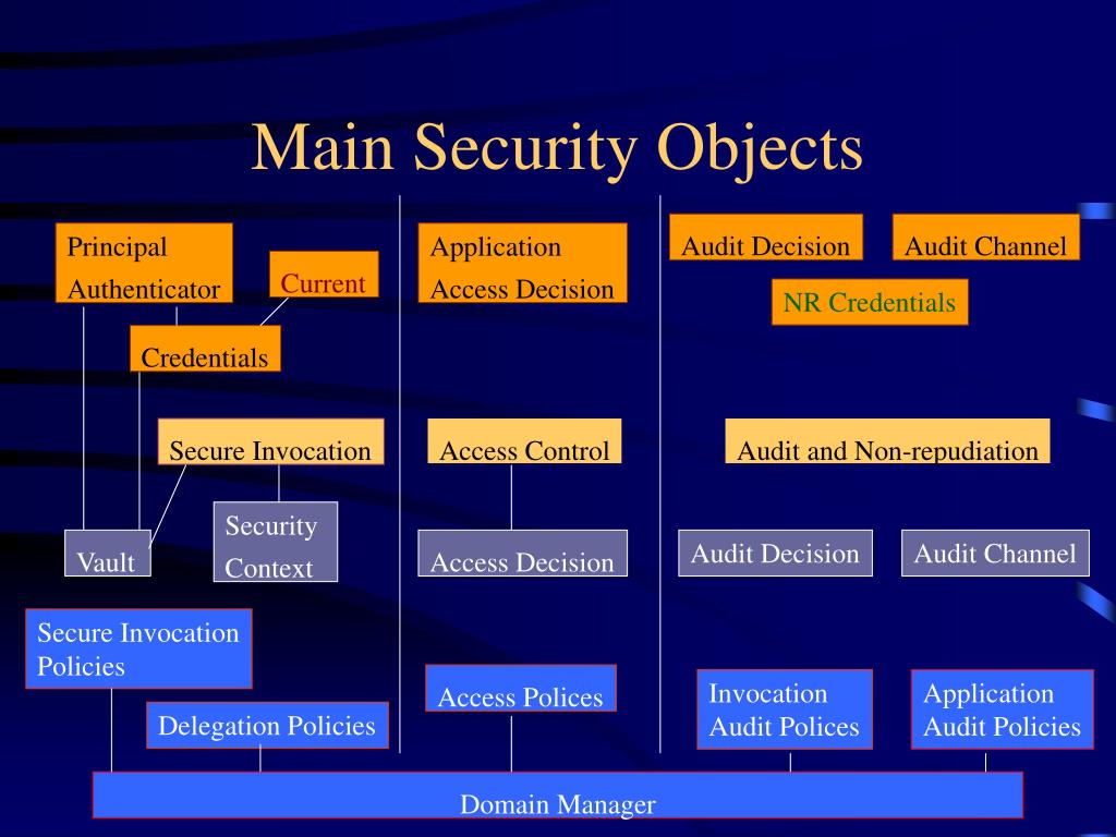 Main Security Objects Audit Decision Audit Channel Principal Authenticator Application Access Decision Current NR Credentials Credentials Secure Invocation Access Control Audit and Non-repudiation Security Context Vault Access Decision Audit Decision Audit Channel Secure Invocation Policies Access Polices Invocation Audit Polices Application Audit Policies Delegation Policies Domain Manager