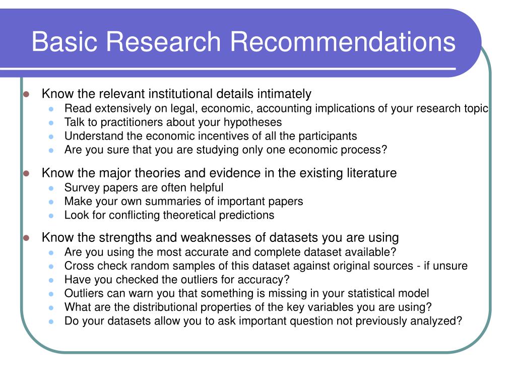 Basic Research Recommendations • Know the relevant institutional details intimately • Read extensively on legal, economic, accounting implications of your research topic • Talk to practitioners about your hypotheses • Understand the economic incentives of all the participants • Are you sure that you are studying only one economic process? • Know the major theories and evidence in the existing literature • Survey papers are often helpful • Make your own summaries of important papers • Look for conflicting theoretical predictions • Know the strengths and weaknesses of datasets you are using • Are you using the most accurate and complete dataset available? • Cross check random samples of this dataset against original sources - if unsure • Have you checked the outliers for accuracy? • Outliers can warn you that something is missing in your statistical model • What are the distributional properties of the key variables you are using? • Do your datasets allow you to ask important question not previously analyzed?