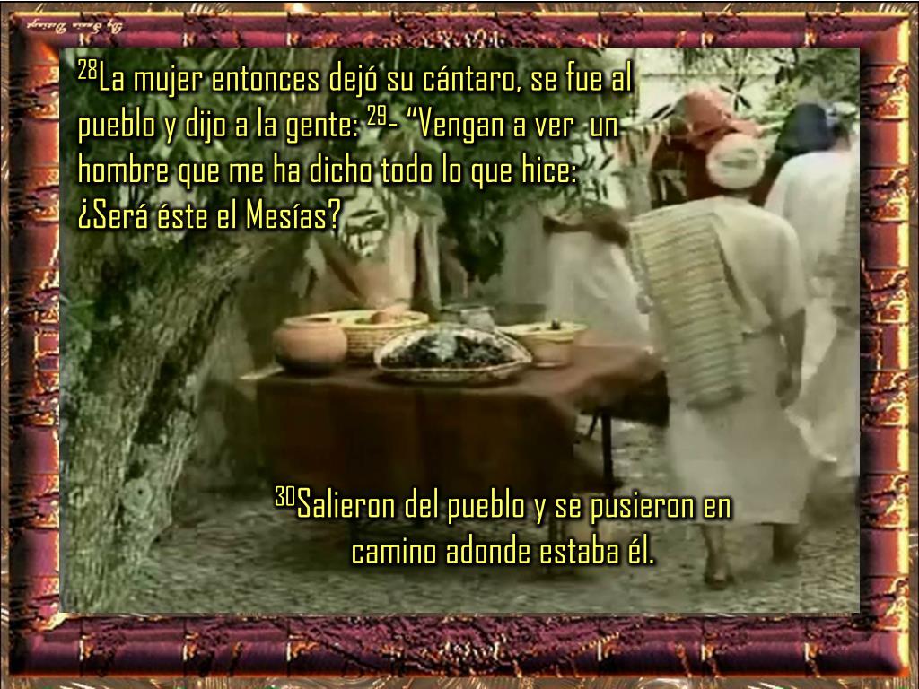 28La mujer entonces dejó su cántaro, se fue al pueblo y dijo a la gente: 29- “Vengan a ver un hombre que me ha dicho todo lo que hice: ¿Será éste el Mesías? 30Salieron del pueblo y se pusieron en camino adonde estaba él.