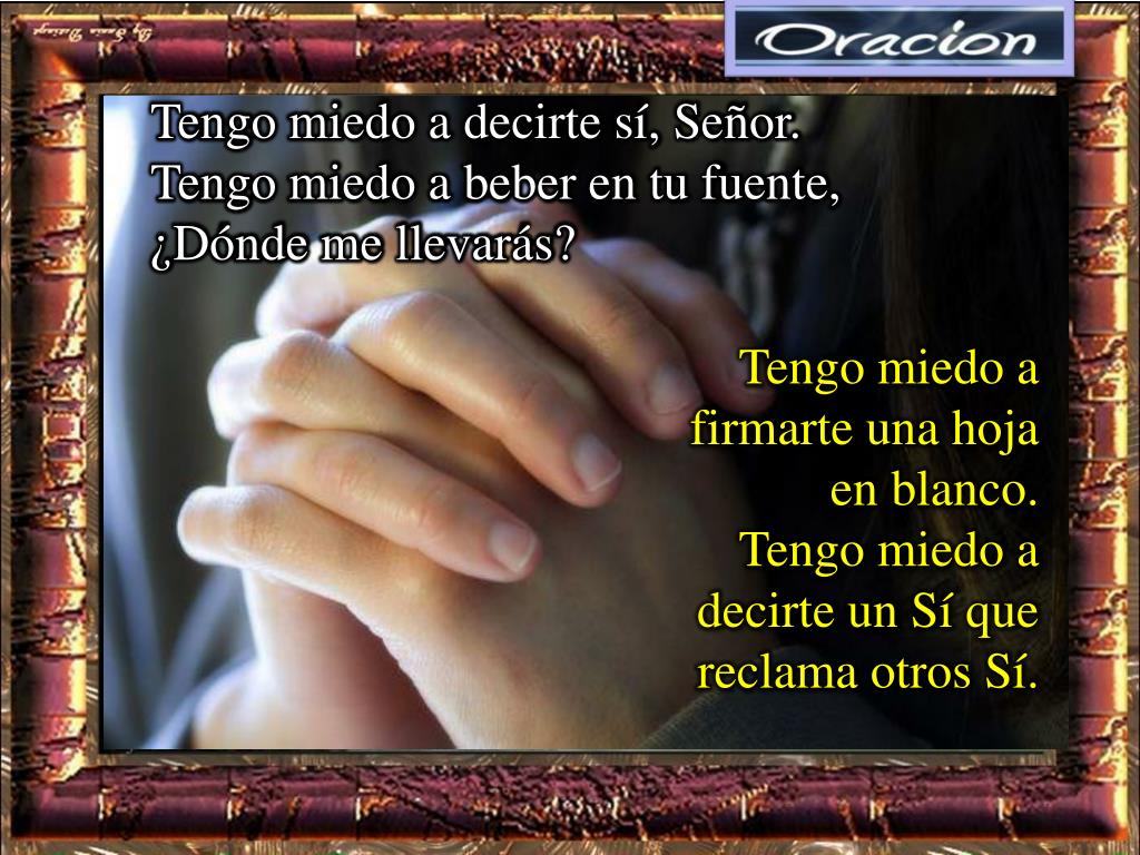 Tengo miedo a decirte sí, Señor. • Tengo miedo a beber en tu fuente, • ¿Dónde me llevarás? Tengo miedo a firmarte una hoja en blanco. Tengo miedo a decirte un Sí que reclama otros Sí.