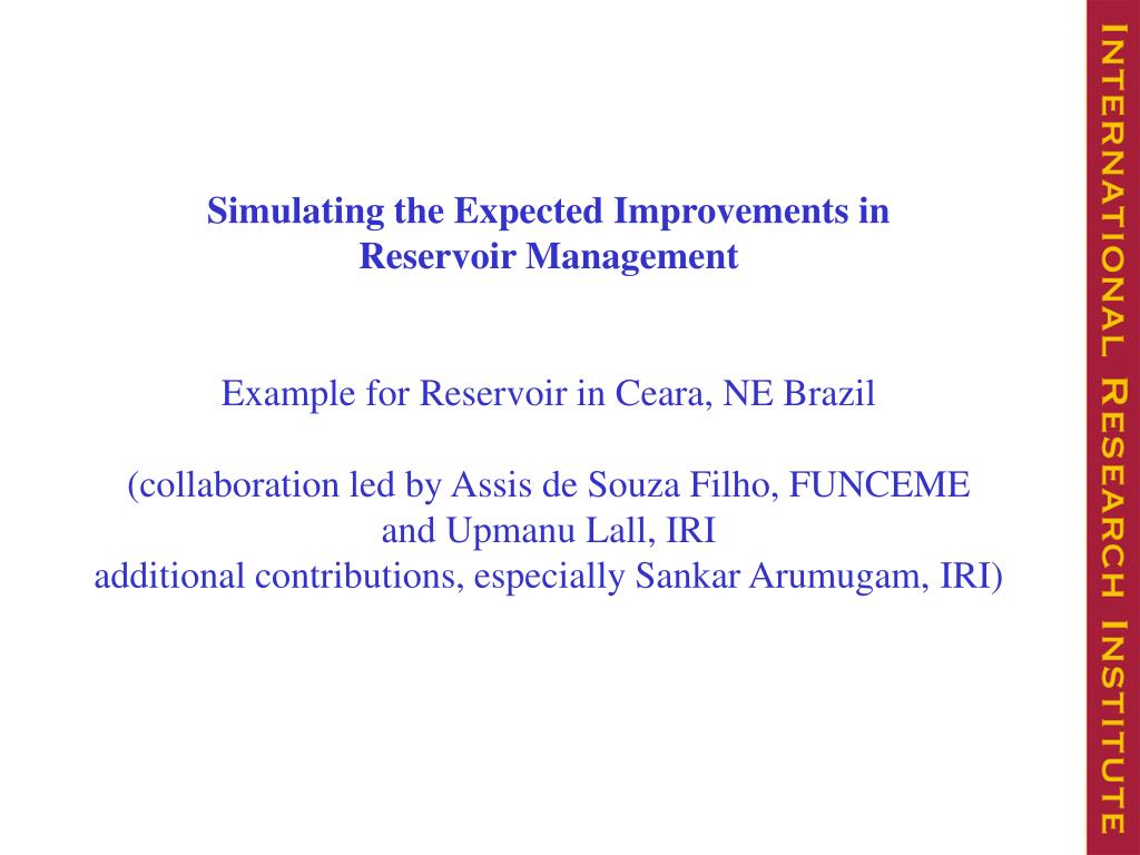 Simulating the Expected Improvements in Reservoir Management Example for Reservoir in Ceara, NE Brazil (collaboration led by Assis de Souza Filho, FUNCEME and Upmanu Lall, IRI additional contributions, especially Sankar Arumugam, IRI)