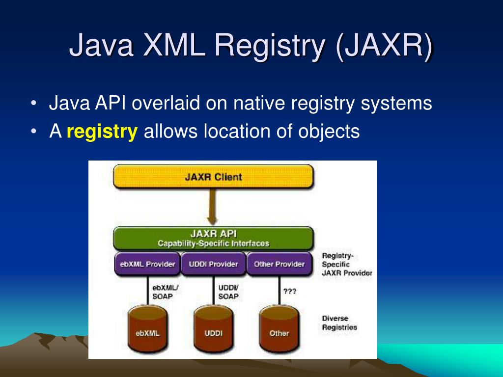 Java XML Registry (JAXR) • Java API overlaid on native registry systems • A registry allows location of objects