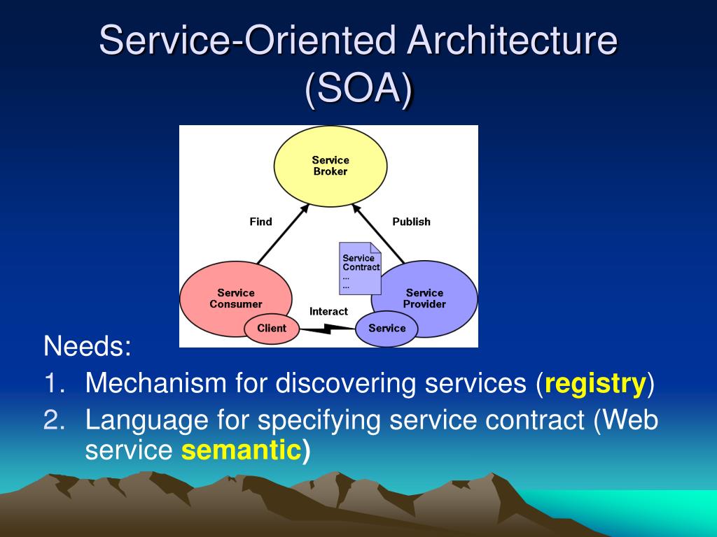 Service-Oriented Architecture (SOA) Needs: • Mechanism for discovering services (registry) • Language for specifying service contract (Web service semantic)