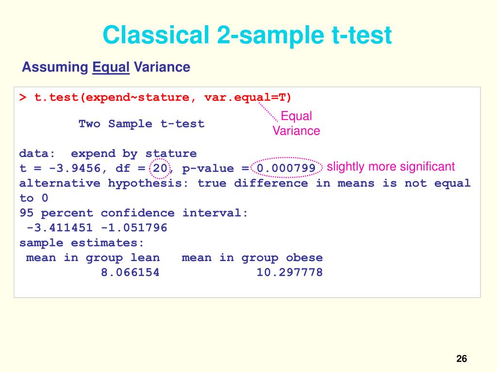 Classical 2-sample t-test Assuming Equal Variance > t.test(expend~stature, var.equal=T) Two Sample t-test data: expend by stature t = -3.9456, df = 20, p-value = 0.000799 alternative hypothesis: true difference in means is not equal to 0 95 percent confidence interval: -3.411451 -1.051796 sample estimates: mean in group lean mean in group obese 8.066154 10.297778 Equal Variance slightly more significant