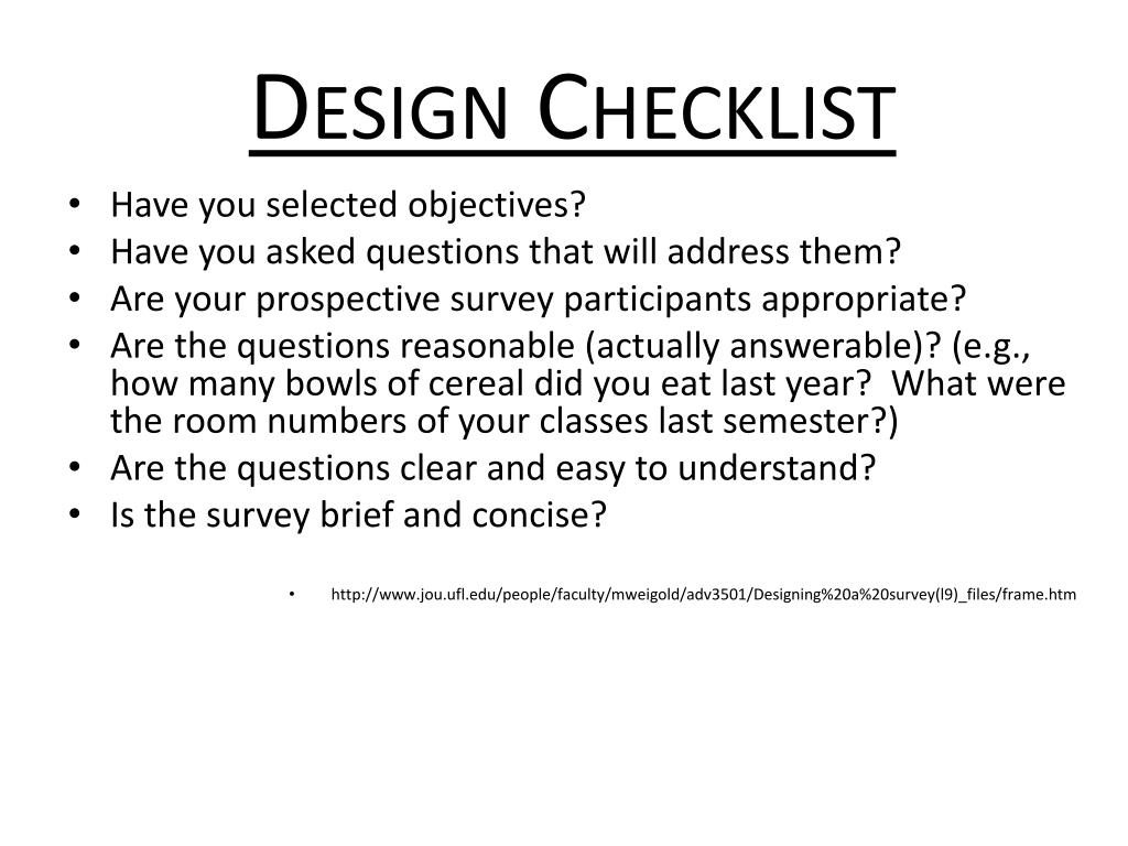 Design Checklist • Have you selected objectives? • Have you asked questions that will address them? • Are your prospective survey participants appropriate? • Are the questions reasonable (actually answerable)? (e.g., how many bowls of cereal did you eat last year? What were the room numbers of your classes last semester?) • Are the questions clear and easy to understand? • Is the survey brief and concise? • http://www.jou.ufl.edu/people/faculty/mweigold/adv3501/Designing%20a%20survey(l9)_files/frame.htm