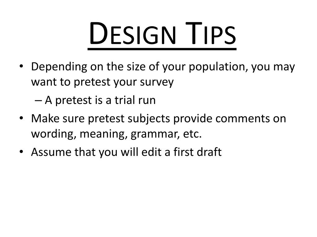 Design Tips • Depending on the size of your population, you may want to pretest your survey • A pretest is a trial run • Make sure pretest subjects provide comments on wording, meaning, grammar, etc. • Assume that you will edit a first draft