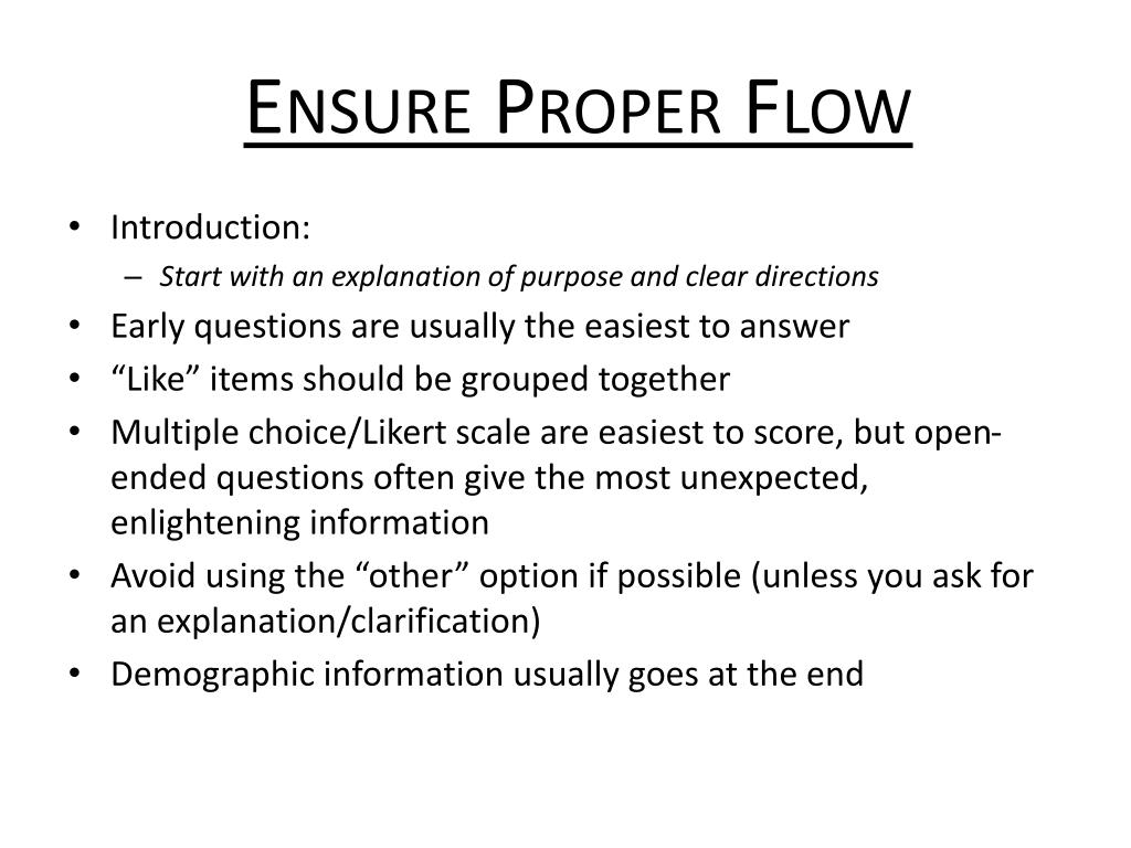Ensure Proper Flow • Introduction: • Start with an explanation of purpose and clear directions • Early questions are usually the easiest to answer • “Like” items should be grouped together • Multiple choice/Likert scale are easiest to score, but open-ended questions often give the most unexpected, enlightening information • Avoid using the “other” option if possible (unless you ask for an explanation/clarification) • Demographic information usually goes at the end