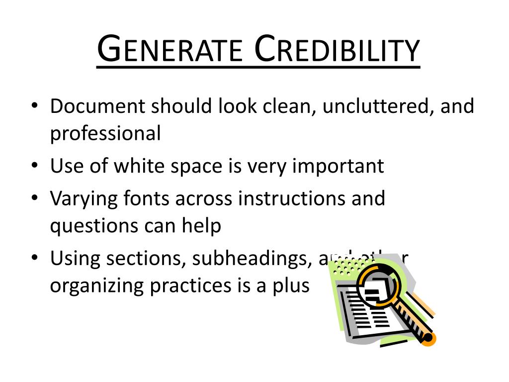 Generate Credibility • Document should look clean, uncluttered, and professional • Use of white space is very important • Varying fonts across instructions and questions can help • Using sections, subheadings, and other organizing practices is a plus