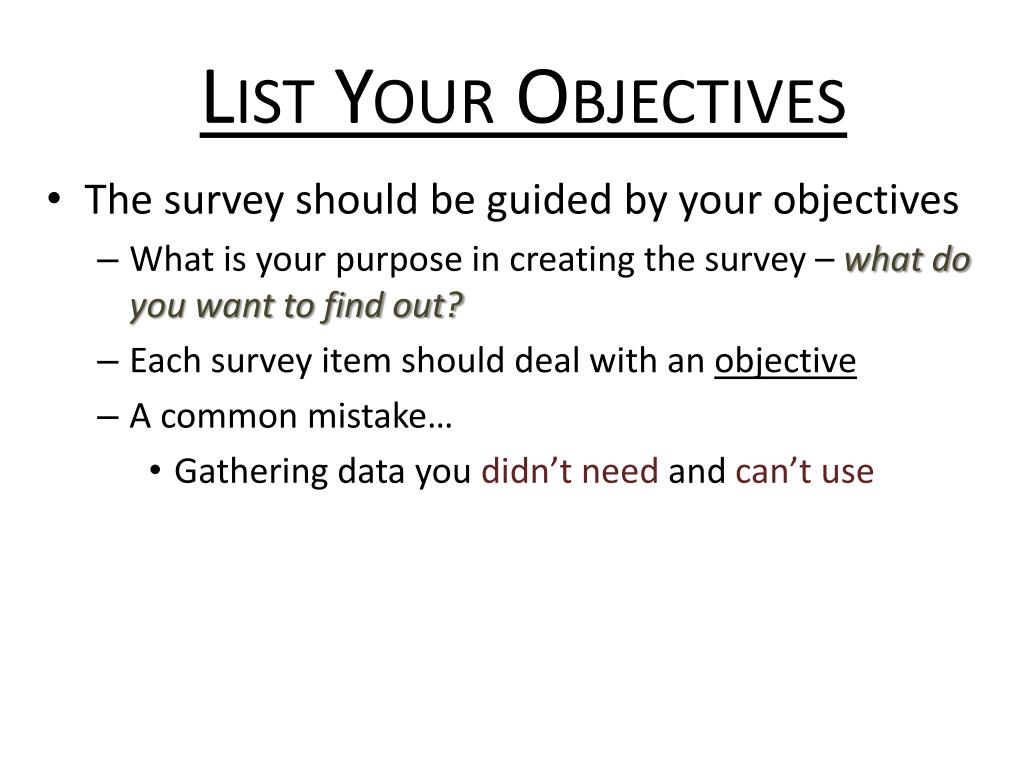 List Your Objectives • The survey should be guided by your objectives • What is your purpose in creating the survey – what do you want to find out? • Each survey item should deal with an objective • A common mistake… • Gathering data you didn’t need and can’t use