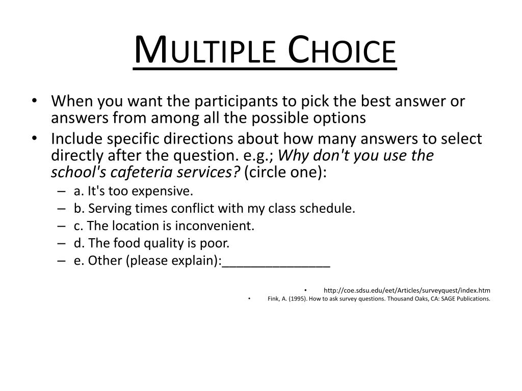 Multiple Choice • When you want the participants to pick the best answer or answers from among all the possible options • Include specific directions about how many answers to select directly after the question. e.g.; Why don't you use the school's cafeteria services? (circle one): • a. It's too expensive. • b. Serving times conflict with my class schedule. • c. The location is inconvenient. • d. The food quality is poor. • e. Other (please explain):_______________ • http://coe.sdsu.edu/eet/Articles/surveyquest/index.htm • Fink, A. (1995). How to ask survey questions. Thousand Oaks, CA: SAGE Publications.