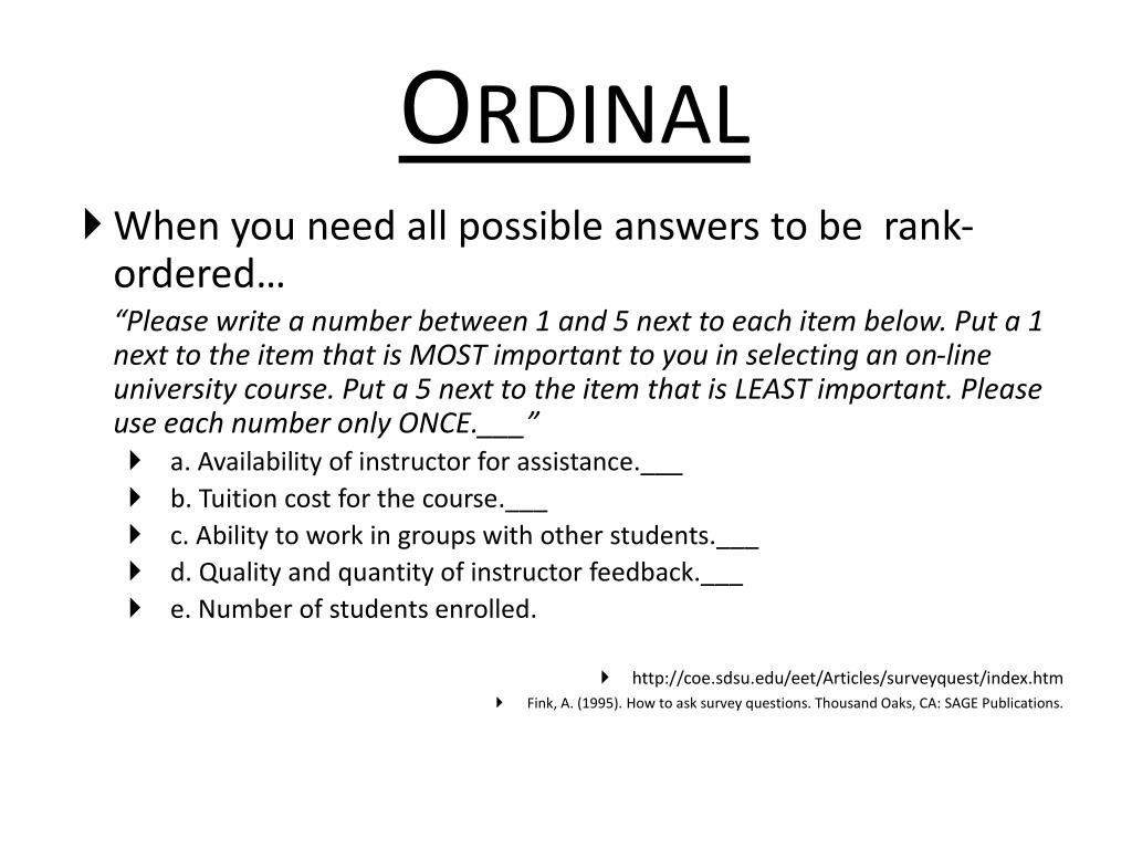 Ordinal • When you need all possible answers to be rank-ordered… “Please write a number between 1 and 5 next to each item below. Put a 1 next to the item that is MOST important to you in selecting an on-line university course. Put a 5 next to the item that is LEAST important. Please use each number only ONCE.___” • a. Availability of instructor for assistance.___ • b. Tuition cost for the course.___ • c. Ability to work in groups with other students.___ • d. Quality and quantity of instructor feedback.___ • e. Number of students enrolled. • http://coe.sdsu.edu/eet/Articles/surveyquest/index.htm • Fink, A. (1995). How to ask survey questions. Thousand Oaks, CA: SAGE Publications.