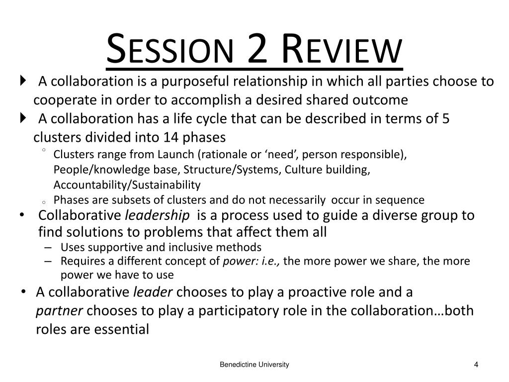 Session 2 Review • A collaboration is a purposeful relationship in which all parties choose to cooperate in order to accomplish a desired shared outcome • A collaboration has a life cycle that can be described in terms of 5 clusters divided into 14 phases • Clusters range from Launch (rationale or ‘need’, person responsible), People/knowledge base, Structure/Systems, Culture building, Accountability/Sustainability • Phases are subsets of clusters and do not necessarily occur in sequence • Collaborative leadership is a process used to guide a diverse group to find solutions to problems that affect them all • Uses supportive and inclusive methods • Requires a different concept of power: i.e., the more power we share, the more power we have to use • A collaborative leader chooses to play a proactive role and a partner chooses to play a participatory role in the collaboration…both roles are essential Benedictine University
