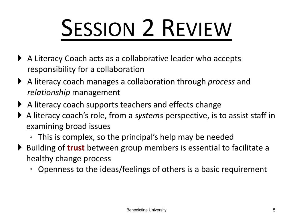 Session 2 Review • A Literacy Coach acts as a collaborative leader who accepts responsibility for a collaboration • A literacy coach manages a collaboration through process and relationship management • A literacy coach supports teachers and effects change • A literacy coach’s role, from a systems perspective, is to assist staff in examining broad issues • This is complex, so the principal’s help may be needed • Building of trust between group members is essential to facilitate a healthy change process • Openness to the ideas/feelings of others is a basic requirement Benedictine University