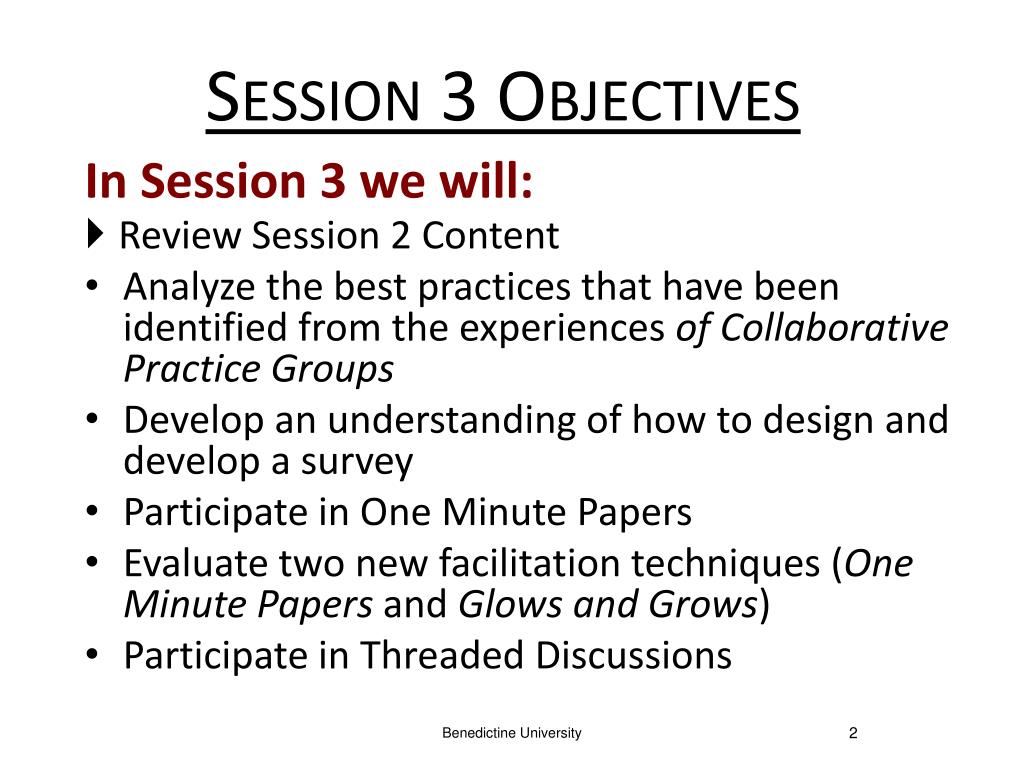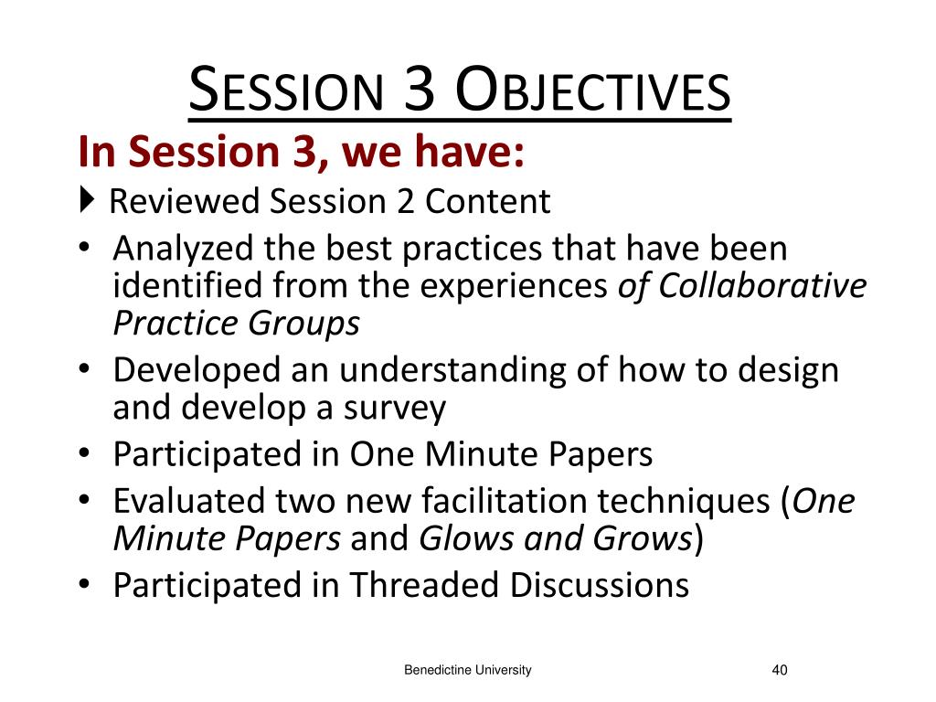 Session 3 Objectives In Session 3, we have: • Reviewed Session 2 Content • Analyzed the best practices that have been identified from the experiences of Collaborative Practice Groups • Developed an understanding of how to design and develop a survey • Participated in One Minute Papers • Evaluated two new facilitation techniques (One Minute Papers and Glows and Grows) • Participated in Threaded Discussions Benedictine University