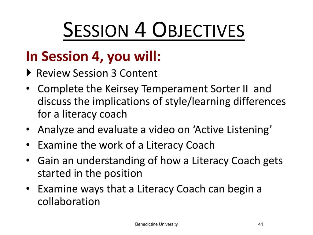 Session 4 Objectives In Session 4, you will: • Review Session 3 Content • Complete the Keirsey Temperament Sorter II and discuss the implications of style/learning differences for a literacy coach • Analyze and evaluate a video on ‘Active Listening’ • Examine the work of a Literacy Coach • Gain an understanding of how a Literacy Coach gets started in the position • Examine ways that a Literacy Coach can begin a collaboration Benedictine University