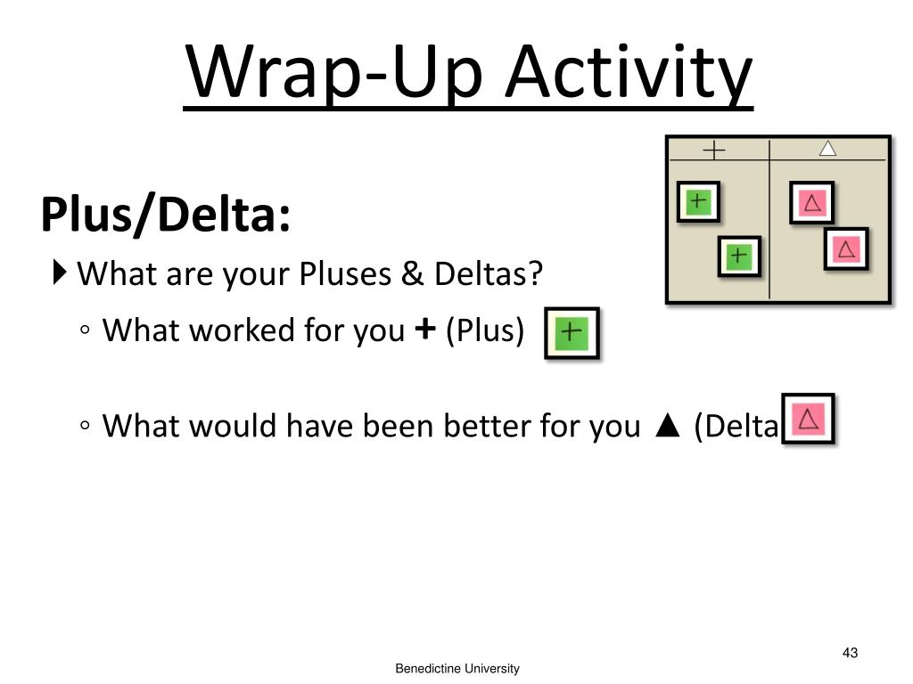 Wrap-Up Activity Plus/Delta: • What are your Pluses & Deltas? • What worked for you + (Plus) • What would have been better for you ▲ (Delta) Benedictine University