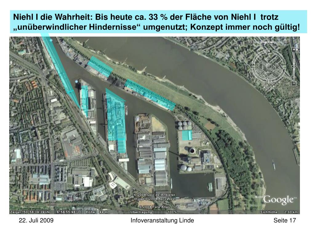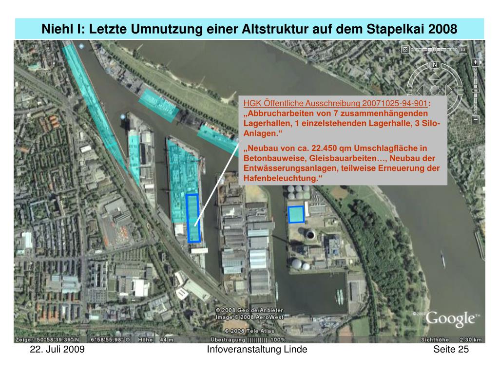 Die bessere Zukunft der Kölner Häfen ...z.B. HGK (Häfen und Güterverkehr Köln AG) …Antrag Planfeststellungsverfahren 2004: „…die Erweiterungsmöglichkeiten für den Containerbetrieb im Hafen Niehl I (sind) erschöpft…“Quelle: Antrag der HGK auf Planfeststellung nach §31 WHG am 25.06.2004 - Seite 88 …Vorstandssprecher Dr. Bender:„Wir platzen in Niehl aus allen Nähten.“Quelle: „Neues Containerterminal geplant“, Kölnische Rundschau 11.8.2005 …Pressesprecher Rolf Küppers:„Wir würden in Godorf nicht 60 Millionen Euro in den Ausbau investieren, wenn wir in Niehl genügend Reserveflächen hätten.“Quelle: „Man hat uns Märchen erzählt“, Kölner Stadt-Anzeiger, 4.6.2008 - Seite 26 Infoveranstaltung Linde