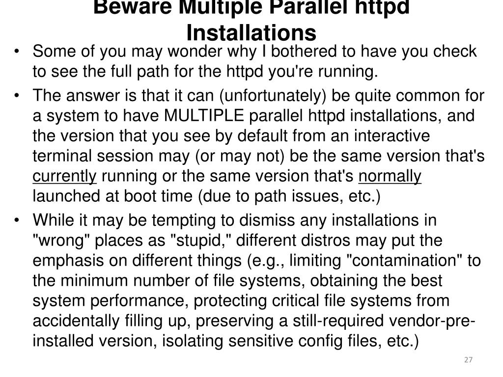 Beware Multiple Parallel httpd Installations • Some of you may wonder why I bothered to have you check to see the full path for the httpd you're running. • The answer is that it can (unfortunately) be quite common for a system to have MULTIPLE parallel httpd installations, and the version that you see by default from an interactive terminal session may (or may not) be the same version that's currently running or the same version that's normally launched at boot time (due to path issues, etc.) • While it may be tempting to dismiss any installations in "wrong" places as "stupid," different distros may put the emphasis on different things (e.g., limiting "contamination" to the minimum number of file systems, obtaining the best system performance, protecting critical file systems from accidentally filling up, preserving a still-required vendor-pre-installed version, isolating sensitive config files, etc.)