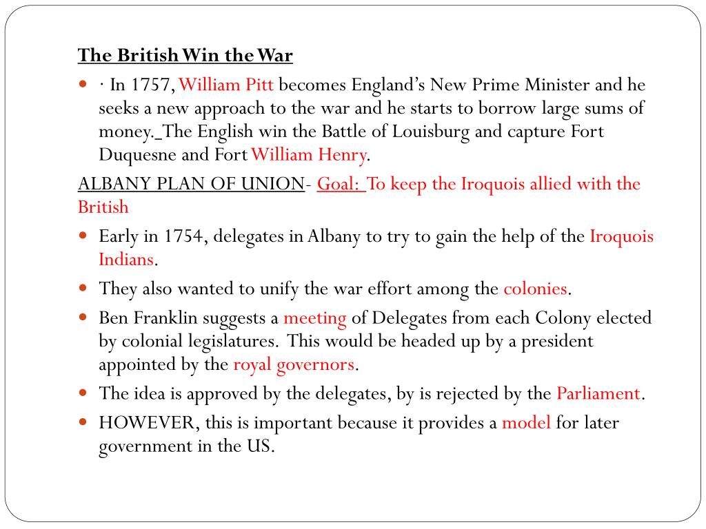 The British Win the War • · In 1757, William Pitt becomes England’s New Prime Minister and he seeks a new approach to the war and he starts to borrow large sums of money.The English win the Battle of Louisburg and capture Fort Duquesne and Fort William Henry. ALBANY PLAN OF UNION-Goal: To keep the Iroquois allied with the British • Early in 1754, delegates in Albany to try to gain the help of the Iroquois Indians. • They also wanted to unify the war effort among the colonies. • Ben Franklin suggests a meeting of Delegates from each Colony elected by colonial legislatures. This would be headed up by a president appointed by the royal governors. • The idea is approved by the delegates, by is rejected by the Parliament. • HOWEVER, this is important because it provides a model for later government in the US.