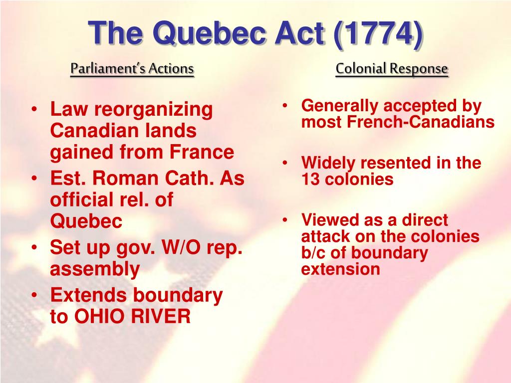 The Quebec Act (1774) Parliament’s Actions Colonial Response • Law reorganizing Canadian lands gained from France • Est. Roman Cath. As official rel. of Quebec • Set up gov. W/O rep. assembly • Extends boundary to OHIO RIVER • Generally accepted by most French-Canadians • Widely resented in the 13 colonies • Viewed as a direct attack on the colonies b/c of boundary extension