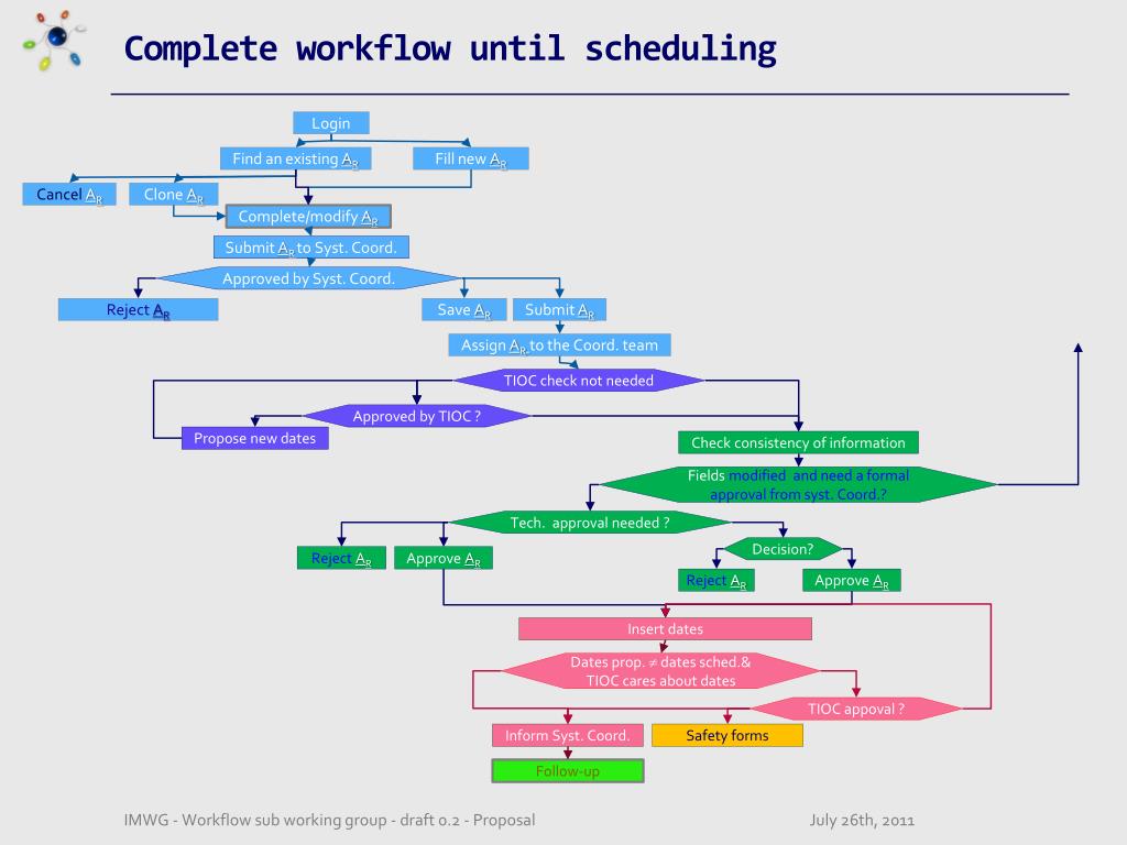 Complete workflowuntilscheduling Login Find an existing AR Fill new AR Cancel AR Clone AR Complete/modify AR Submit AR to Syst. Coord. Approved by Syst.Coord. Reject AR Save AR Submit AR Assign ARto the Coord. team TIOC check not needed Approved by TIOC ? Propose new dates Check consistency of information Fields modified and need a formal approval from syst. Coord.? Tech.approval needed ? Decision? RejectAR Approve AR RejectAR Approve AR Insert dates Dates prop. dates sched.& TIOC cares about dates TIOC appoval ? Inform Syst. Coord. Safety forms Follow-up IMWG - Workflow sub working group - draft 0.2 - Proposal July 26th, 2011