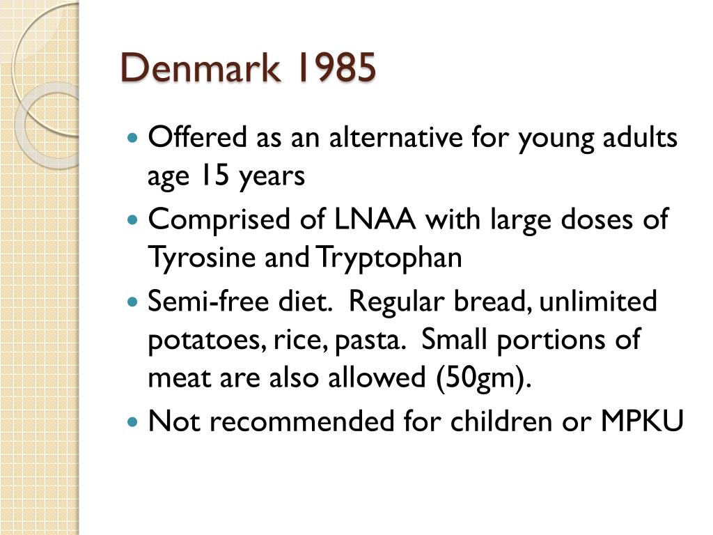 Denmark 1985 • Offered as an alternative for young adults age 15 years • Comprised of LNAA with large doses of Tyrosine and Tryptophan • Semi-free diet. Regular bread, unlimited potatoes, rice, pasta. Small portions of meat are also allowed (50gm). • Not recommended for children or MPKU