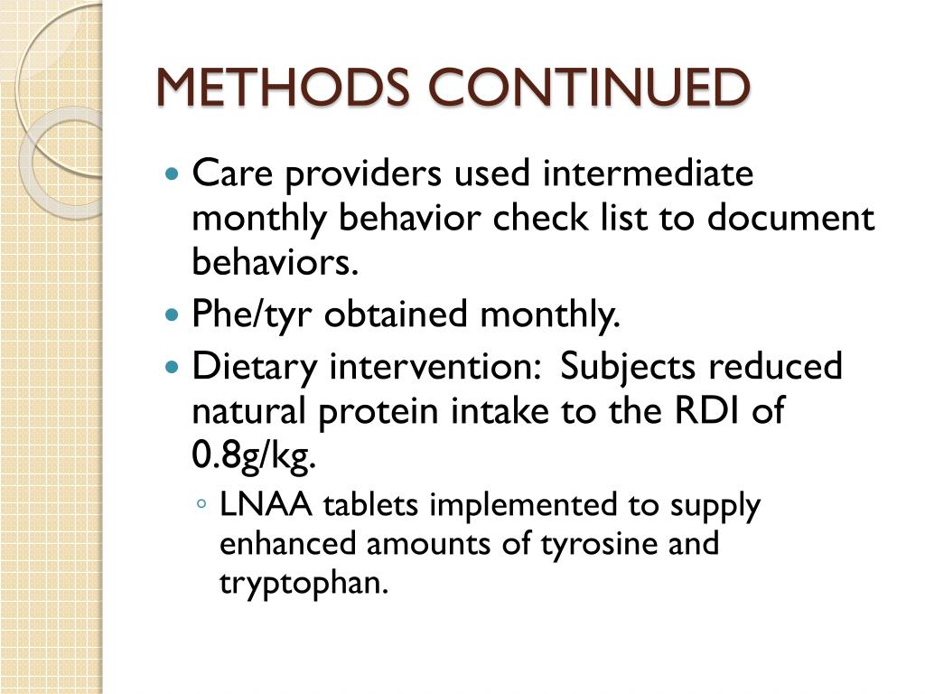 METHODS CONTINUED • Care providers used intermediate monthly behavior check list to document behaviors. • Phe/tyr obtained monthly. • Dietary intervention: Subjects reduced natural protein intake to the RDI of 0.8g/kg. • LNAA tablets implemented to supply enhanced amounts of tyrosine and tryptophan.