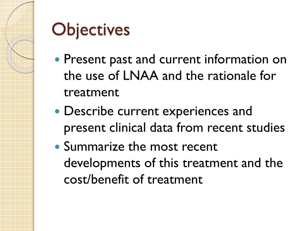 Objectives • Present past and current information on the use of LNAA and the rationale for treatment • Describe current experiences and present clinical data from recent studies • Summarize the most recent developments of this treatment and the cost/benefit of treatment