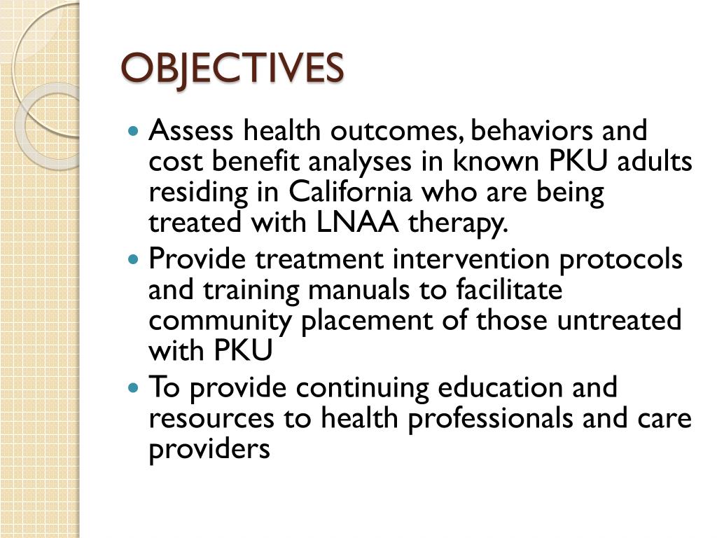OBJECTIVES • Assess health outcomes, behaviors and cost benefit analyses in known PKU adults residing in California who are being treated with LNAA therapy. • Provide treatment intervention protocols and training manuals to facilitate community placement of those untreated with PKU • To provide continuing education and resources to health professionals and care providers