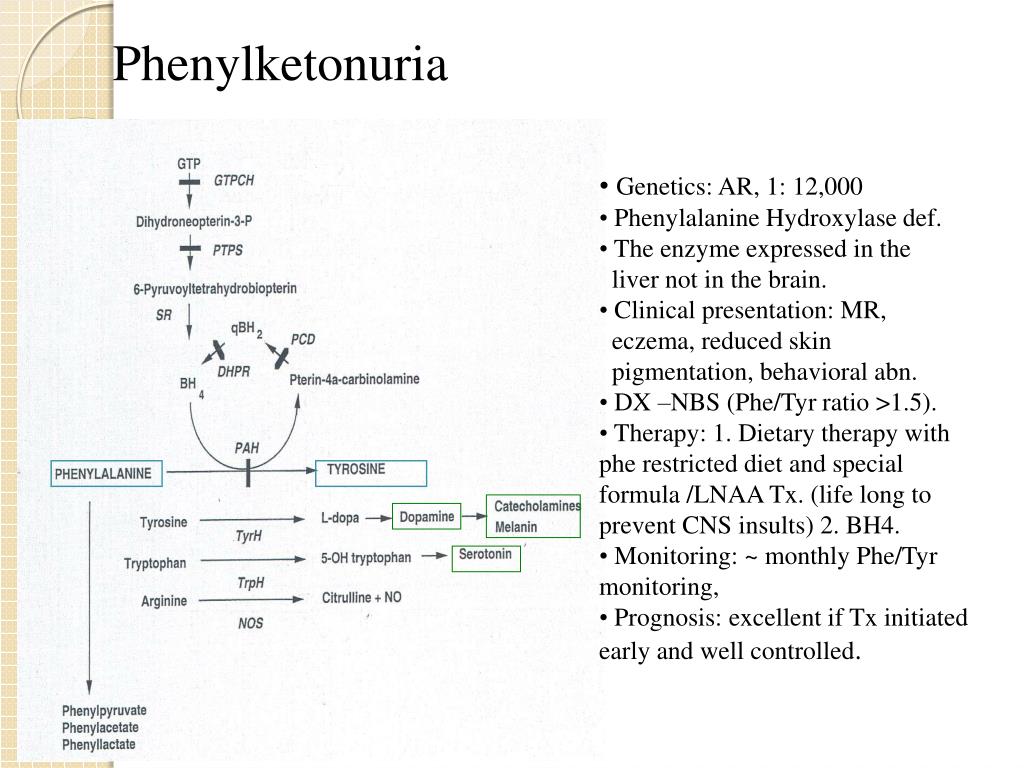 Phenylketonuria • Genetics: AR, 1: 12,000 • Phenylalanine Hydroxylase def. • The enzyme expressed in the • liver not in the brain. • Clinical presentation: MR, • eczema, reduced skin • pigmentation, behavioral abn. • DX –NBS (Phe/Tyr ratio >1.5). • Therapy: 1. Dietary therapy with phe restricted diet and special formula /LNAA Tx. (life long to prevent CNS insults) 2. BH4. • Monitoring: ~ monthly Phe/Tyr monitoring, • Prognosis: excellent if Tx initiated early and well controlled.