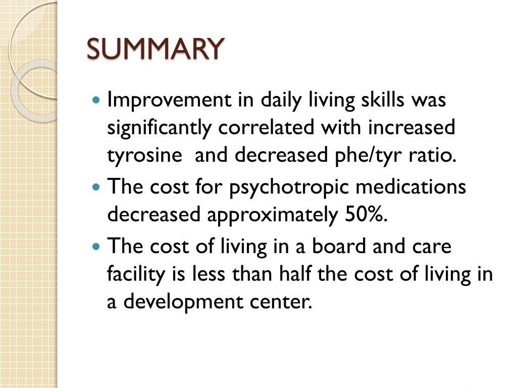 SUMMARY • Improvement in daily living skills was significantly correlated with increased tyrosine and decreased phe/tyr ratio. • The cost for psychotropic medications decreased approximately 50%. • The cost of living in a board and care facility is less than half the cost of living in a development center.
