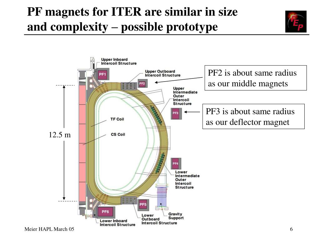 PF magnets for ITER are similar in size and complexity – possible prototype PF2 is about same radius as our middle magnets PF3 is about same radius as our deflector magnet 12.5 m Meier HAPL March 05