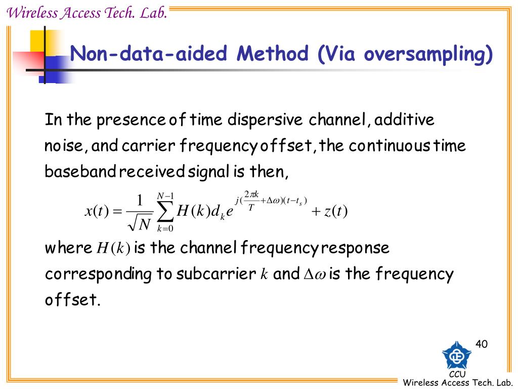 Non-data-aided Method (Via oversampling) • Perfect recovery of carrier frequency offset in the absence of noise