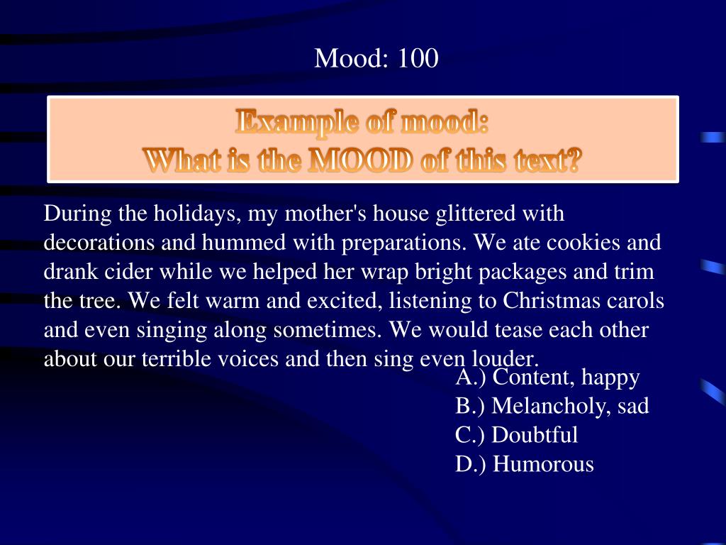 Mood: 100 Example of mood:What is the MOOD of this text? During the holidays, my mother's house glittered with decorations and hummed with preparations. We ate cookies and drank cider while we helped her wrap bright packages and trim the tree. We felt warm and excited, listening to Christmas carols and even singing along sometimes. We would tease each other about our terrible voices and then sing even louder. A.) Content, happy B.) Melancholy, sad C.) Doubtful D.) Humorous