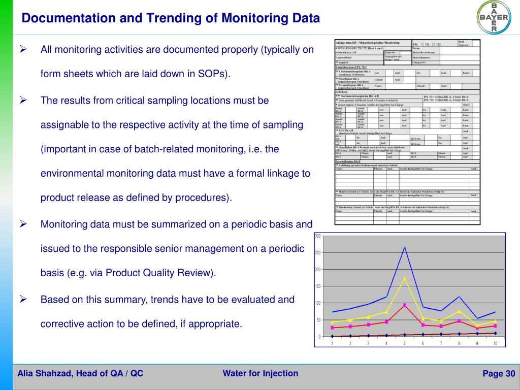 Documentation and Trending of Monitoring Data • All monitoring activities are documented properly (typically on form sheets which are laid down in SOPs). • The results from critical sampling locations must be assignable to the respective activity at the time of sampling (important in case of batch-related monitoring, i.e. the environmental monitoring data must have a formal linkage to product release as defined by procedures). • Monitoring data must be summarized on a periodic basis and issued to the responsible senior management on a periodic basis (e.g. via Product Quality Review). • Based on this summary, trends have to be evaluated and corrective action to be defined, if appropriate.