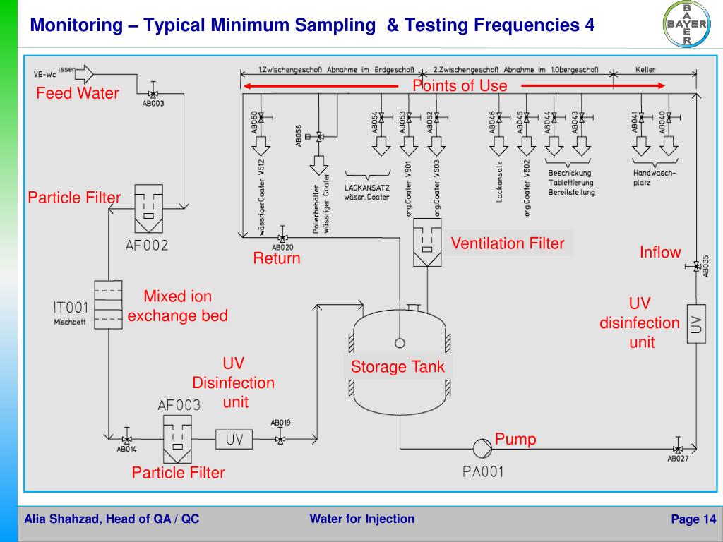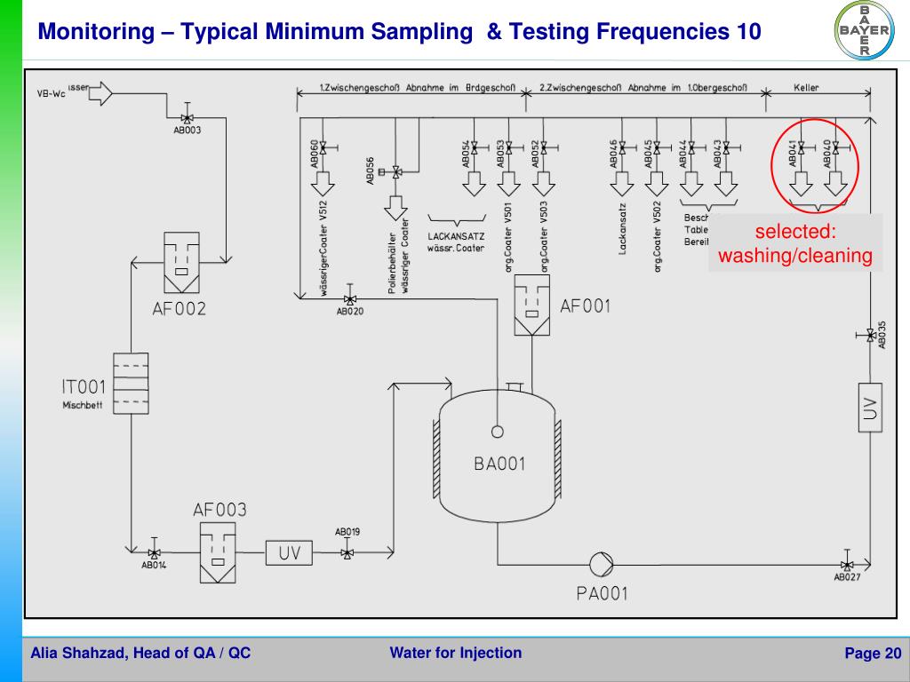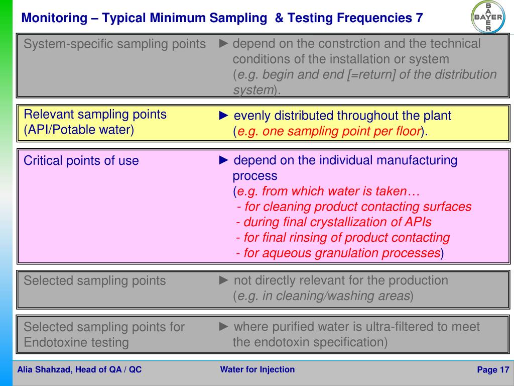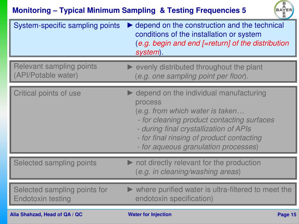 Sampling • Sampling sites must be selected based on a riskevaluation and / or as result of the initialqualification. • Samples have to be taken from representativelocations within the distribution and processingsystem. • Selection of sampling sites must not compromise the quality (e.g.: microbiological status) of the system being monitored. • The sampling plan has to be dynamic allowing for adjustments to sampling frequency and locations based on system performance trends. • When routine monitoring points are reduced or increased, the reasonfor the change has to be documented. • Sampling practice must simulate the use of a process system during manufacturing, for example where water for manufacturing is delivered through a hose, sampling has to be performed through this hose.