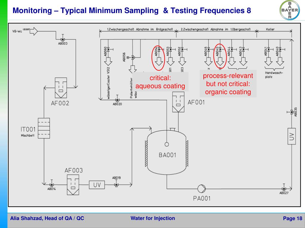 Q & A • Purified water systems have to be sampled (monitored) daily for microbiological testing. • For chemical/physical testing of water systems, it is highly recommended to define the last point of use (return) in the system as a routine sampling point. • Any Alert Level excursion initiates an immediate OoS-procedure. • Purified water with endotoxin limit is required for the final purification of a non-sterile API to be used in a sterile parenteral Drug Product.